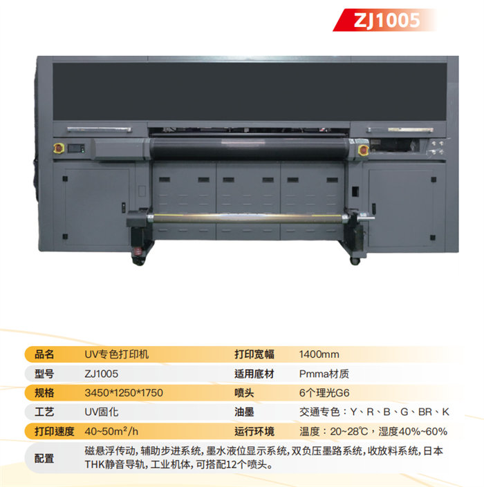 Impresora UV de color directo ZJ1005: Diseñada específicamente para materiales PMMA, esta máquina cuenta con un ancho de impresión de 1400 mm y está equipada con 6 cabezales de impresión Ricoh G6 de grado industrial. Capaz de alcanzar velocidades de hasta 40-50 m²/h, maneja a la perfección colores específicos para tráfico (amarillo, rojo, azul, verde, marrón y negro) gracias a su transmisión por levitación magnética, que garantiza un funcionamiento ultrasilencioso y preciso.