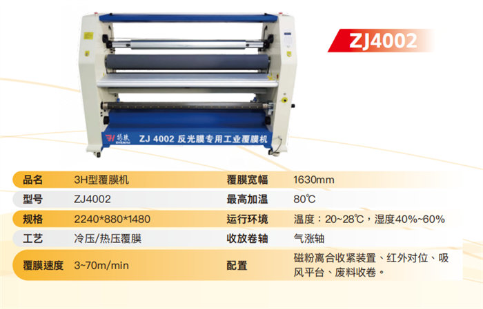 Laminadora de película reflectante dedicada tipo 3H ZJ4002 (1630 mm): Una máquina de grado industrial que cuenta con control de tensión mediante embrague de polvo magnético, alineación por infrarrojos y una plataforma de succión al vacío, con velocidades de empuje de hasta 3-70 m/min.