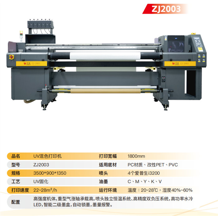 Impresora UV de colores mixtos ZJ2003: Una potente y versátil impresora con un ancho de 1800 mm, que utiliza 4 cabezales de impresión Epson i3200. Ideal para sustratos de PC, PET modificado y PVC, ofrece una impresión vibrante en colores C, M, Y, K y V a una velocidad de 22-28 m²/h, gracias a un sistema inteligente de cartuchos de tinta secundarios.