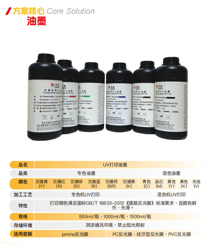 La calidad de una impresora depende de la calidad de su tinta. Nos enorgullece presentar nuestras tintas UV patentadas específicas para señalización vial. Disponibles en colores planos y mixtos (500 ml, 1000 ml, 1500 ml), estas tintas están rigurosamente formuladas para cumplir con la norma GB/T 18833-2012 para películas reflectantes viales. Ofrecen una viveza excepcional, acabados suaves y una resistencia a la intemperie duradera en películas reflectantes de PMMA, PC y PVC.